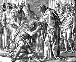 The Midrash and the Talmud differed over which five brothers Joseph presented to Pharaoh in Genesis 47:2, and each source employed the Farewell of Moses in Deuteronomy 33:2–29 to make its argument. The Midrash read the word from among (מִקְצֵה, mikzeh) in Genesis 47:2, "And from among (מִקְצֵה, mikzeh) his brethren he took five men," to mean "from the end," implying inferiority. The Midrash thus concluded that they were not the strongest of the brothers, and named them as Reuben, Simeon, Levi, Benjamin, and Issachar. The Midrash explained that Joseph took these five brothers, because he reasoned that if he presented the strongest to Pharaoh, then Pharaoh would on make them his warriors. Therefore, Joseph presented these five, who were not mighty men. The Midrash taught that we know that they were not strong from the blessing of Moses in Deuteronomy 33:2–29, where every brother whose name Moses repeated in his blessing was mighty, while every brother whose name Moses did not repeat was not mighty. Judah, whose name he repeated, was mighty, for Deuteronomy 33:7 says, "And this for Judah, and he said: 'Hear, Lord, the voice of Judah'"; therefore, Joseph did not present him to Pharaoh. Likewise Naphtali, as Deuteronomy 33:23 says, "And of Naphtali he said: 'O Naphtali, satisfied with favor.'" Likewise, Asher, of whom Deuteronomy 33:24 says, "And of Asher he said: 'Blessed be Asher above sons.'" Likewise Dan, of whom Deuteronomy 33:22 says, "And of Dan he said: 'Dan is a lion's whelp.'" Zebulun too, of whom Deuteronomy 33:18 says, "And of Zebulun he said: 'Rejoice, Zebulun, in your going out.'" Gad too, of whom Deuteronomy 33:20 says, "And of Gad he said: 'Blessed be He that enlarges Gad.'" Therefore, Joseph did not present them to Pharaoh. But the others, whose names were not repeated, were not mighty, therefore he presented them to Pharaoh.[77] In the Babylonian Talmud, however, Rava asked Rabbah bar Mari who the five were. Rabbah bar Mari replied that Rabbi Joḥanan said that they were those whose names were repeated in the Farewell of Moses, Deuteronomy 33:2–29 (and thus the mightier of the brothers). Besides Judah, the five whose names Moses repeated were Dan, Zebulun, Gad, Asher and Naphtali. Explaining why Moses repeated Judah's name in Deuteronomy 33:7, but Joseph nonetheless excluded him from the five, Rabbah bar Mari explained that Moses repeated Judah's name for a different purpose, which Rabbi Samuel bar Naḥmani recounted that Rabbi Joḥanan said. Rabbi Joḥanan interpreted the words of Deuteronomy 33:6–7, "Let Reuben live and not die, in that his men become few, and this is for Judah," to teach that during the 40 years that the Israelites were in the wilderness, the bones of Judah rolled around detached in the coffin that conveyed the bones of the heads of the tribes from Egypt to the Promised Land along with Joseph's remains. But then Moses solicited God for mercy by noting that Judah brought Reuben to confess his own sin in Genesis 35:22 and Genesis 49:4 (lying with Bilhah) by himself making public confession in Genesis 38:26 (when Judah admitted that Tamar was more righteous than he was). Therefore, in Deuteronomy 33:7, Moses exhorted God: "Hear Lord the voice of Judah!" Thereupon God fitted each of Judah's limbs into its original place as one whole skeleton. Judah was, however, not permitted to ascend to the heavenly academy, until Moses said in Deuteronomy 33:7, "And bring him in to his people." As, however, Judah still did not know what the Rabbis were saying in that assembly and was thus unable to argue with the Rabbis on matters of the law, Moses said in Deuteronomy 33:7, "His hands shall contend for him!" As again he was unable to conclude legal discussions in accordance with the Law, Moses said in Deuteronomy 33:7, "You shall be a help against his adversaries!"[78]