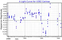 The radial velocity of V382 Carinae has long been known to be variable, but variations in its brightness were unclear. Brightness variations were detected by some observers, but others found it to be constant.[11] It was formally named as a variable star in 1981, listed in the General Catalogue of Variable Stars as a possible δ Cephei variable.[12][3] It has been described as a pseudo-Cepheid, a supergiant with pulsations similar to a Cepheid but less regular.[8]