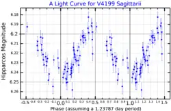 V4199 Sagittarii is a variable star in the southern constellation of Sagittarius.[8] It is a dim star that is just visible to the naked eye with an apparent visual magnitude that varies between 6.22 and 6.28 over a period of 1.23825 days.[9] The star is located at a distance of approximately 689 light years from the Sun based on parallax, but is drifting closer with a radial velocity of roughly −23 km/s.[6] It has an absolute magnitude of −0.63,[3] on average.