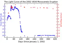 On January 6, 2002, an unknown star was seen to brighten in the constellation Monoceros, the Unicorn.[13] Being a new variable star, it was designated V838 Monocerotis, the 838th variable star of Monoceros. The initial light curve resembled that of a nova, an eruption that occurs when enough hydrogen gas accumulates on the surface of a white dwarf from its close binary companion. Therefore, the object was also designated Nova Monocerotis 2002. V838 Monocerotis reached a maximum visual magnitude of 6.75 on February 6, 2002, after which it started to dim rapidly, as expected. However, in early March, the star started to brighten again, especially in infrared wavelengths. Yet another brightening in infrared occurred in early April. In 2003, the star returned to near its original brightness before the eruption (magnitude 15.6), but as a red supergiant rather than a blue main-sequence star. The light curve produced by the eruption was unlike anything previously seen.[2] In 2009, the star was about 15,000 L☉,[11] which, in the absence of extinction, would correspond to an apparent magnitude of 8.5.[lower-alpha 1]