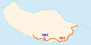 The Via Rápida 2 or VR2 (Fast Road 2 in English) is the second motorway on the island of Madeira. Construction started in 2008[1] In 2011, this construction had to stop due to lands owners[2] and the financial crisis in Portugal[3] In 2015, the construction resumed with funding from the European Regional Development Fund and it was finally opened in 25 April 2017.[4]