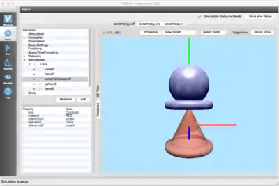 Simulations can be set up in the VSimComposer setup panel. Shapes can be imported or constructed, materials can be assigned to shapes, fields and particles can be added, and algorithms can be chosen. VSimComposer then writes out an input file suitable for use by the Vorpal computational engine.