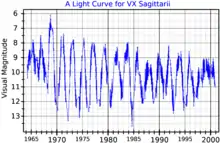 - 1 2 3 4 5 Lockwood, G.W.; Wing, R. F. (1982). "The light and spectrum variations of VX Sagittarii, an extremely cool supergiant". Monthly Notices of the Royal Astronomical Society. 198 (2): 385–404. Bibcode:1982MNRAS.198..385L. doi:10.1093/mnras/198.2.385.