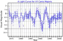 VY Canis Majoris is a variable star that varies from an apparent visual magnitude of 9.6 at minimum brightness to a magnitude of 6.5 at maximum with an estimated pulsational period of 956 days.[2][8] In the General Catalogue of Variable Stars (GCVS) it is classed a semiregular variable of sub-type SRc, indicating a cool supergiant,[2] although it is classed as a type LC slow irregular variable star in the American Association of Variable Star Observers (AAVSO) Variable Star Index.[8] Other periods of 1,600[41] and 2,200[22] days have been derived.