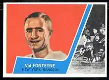 Valere Ronald Fonteyne (born December 2, 1933) is a Canadian former professional ice hockey left winger. He played in the National Hockey League (NHL) from 1959 to 1972, serving the Detroit Red Wings (on two tours of duty), New York Rangers and Pittsburgh Penguins, and in the World Hockey Association (WHA) from 1972 to 1974 with the Alberta/Edmonton Oilers.