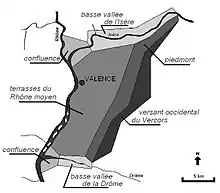 To the north, beyond the Isère Valley, the Romanais continues, geologically, Valence plain. The lower Miocene molasse in the north of the plain was covered by outwash alluvium of the Isère, whose terraces today still mark the shape of the Valentinois.