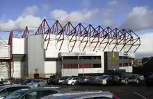 On 17 March 1932, Bradford City paid Midland Railway Company £3,750 for the remaining two-thirds of the site to become outright owners of the ground, which was now 45 years old.[21] The stadium had remained virtually unchanged since 1908, and did so until 1952,[10][18] when the capacity of the ground was reduced after examinations of the foundations were ordered following the 1946 Burnden Park disaster. The investigation resulted in the closure of half the Midland Road stand. The stand's steel frame was then sold to Berwick Rangers for £450 and a smaller replacement stand was built at Valley Parade in 1954.[21] Six years later, the stand had to be demolished for a second time because of continuing foundation problems.[22] It was another six years before all four stands at Valley Parade were able to be opened for the first time. To enable construction of a new stand on the Midland Road side of the ground, the club directors moved the pitch 3 yards (2.7 m) closer to the main stand. The new stand was then the narrowest stand in the league.[22] Further improvements were made to the stand in 1969, ready for the club's FA Cup tie with Division One side Tottenham Hotspur on 3 January 1970,[22] which ended in a 2–2 draw in front of 23,000 fans.[23] The cost of the work forced the club to sell Valley Parade to Bradford Corporation for £35,000, but it was bought back by 1979 for the same price.[24]