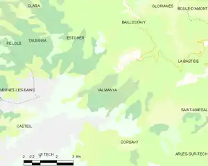 Valmanya is located in the canton of Le Canigou and in the arrondissement of Prades.
