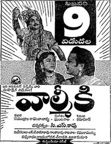Valmiki is 1963 Indian Telugu-language Hindu mythological film, based on the life of Valmiki, produced by S. K. Habibulla under Jupiter Pictures and directed by C. S. Rao. The films stars N. T. Rama Rao and Rajasulochana, with music composed by Ghantasala.[1][2] Director Rao and Jupiter Pictures made the film simultaneously in Kannada with the same title starring Rajkumar in the lead role retaining most of the cast and crew.