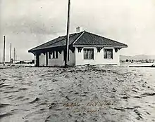 The rail line through the San Fernando Valley was established by the Southern Pacific in 1893. When the Montalvo Cutoff was constructed in 1904, most traffic was diverted over a new mainline which ran diagonally across the valley and the tracks were relegated to branch status.[7] Pacific Electric interurban trains reached Van Nuys by December 1911,[8] crossing the Southern Pacific tracks at Van Nuys Boulevard.[9]