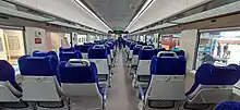 The exterior of the first version of Vande Bharat Express had an aerodynamic design that helped to reduce air resistance at high speeds.[47] It had a driver's cabin at each end, that enables immediate switch in train's direction, unlike a locomotive-hauled train.[48] The 16-car trainset weighs 430 tonnes and has a seating capacity of 1,128 passengers.[49] Two of the centre compartments are first-class compartments that seat 52 each, with the rest being chair car compartments seating 78 each.[50] The chassis of a coach is 23 meters long, and the frame of the train is made entirely of stainless steel.[51] Alternate coaches are motorised to ensure an even distribution of power and quicker acceleration and deceleration. The cars are interconnected and fully sealed to allow better mobility between coaches and reduce noise. The train features a GPS-based passenger information system, bio-vacuum toilets, and rotational seats that can be aligned in the direction of travel in the executive class,[52] and employs a regenerative braking system.[53]