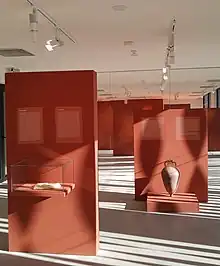 During the third phase at Vani (c. 350–250 BC),[11] Changes in the material culture are prominent. The principal sanctuary on the hilltop had been destroyed and burnt and the ritual ditches had ceased to function; new stone buildings appear including a circuit wall. In addition, traditional Colchis pottery gives way to new forms, notably pear-shaped jugs with red paint on a light ground, familiar in eastern Georgia, anciently known as Iberia, and Greek influence becomes more prominent on the goldwork. Burial in storage-jars becomes the predominant mode.[12] An important find is a 4th-century BC signet-ring bearing, in Greek letters, the name of "Dedatos",[13] probably a local ruler.[14] Lordkipanidze assumes some of these changes may reflect the infiltration of tribes from Iberia, which at that time experienced urbanization, state formation, and expansion.[15][13]