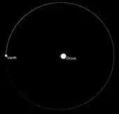 Vanth's orbit is inclined perpendicularly (90°) with respect to the plane of the Solar System, such that it is currently being viewed face-on, or toward the Orcus–Vanth system's north pole, from the perspective of Earth.[11]: 2700–2701 The perspective of Vanth's orbital plane shifts very slowly as the Orcus–Vanth system travels in its 247-year orbit around the Sun.[4] Because of this slow shift in perspective, astronomers were not able determine Vanth's actual orbital inclination until it was reobserved in 2015.[5]: 67 Vanth's orbit will eventually shift from a face-on to an edge-on perspective in the year 2082, which will begin a season of mutual events where Orcus and Vanth take turns eclipsing and transiting each other.[5]: 67
