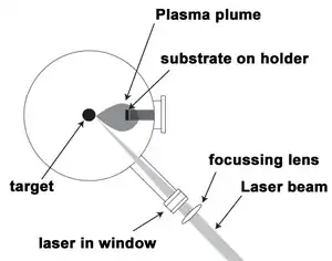 Involves the removal of material from metal-containing solid targets by irradiating the surface with high-powered (~100 mJ/pulse) short (10 Hz) laser pulses, usually with wavelengths in the ultraviolet (UV) region of the light spectrum. When such a laser pulse is adsorbed by a solid target, material from the surface region of the target absorbs the laser energy and either (a) evaporates or sublimates from the surface or is (b) converted into a plasma (see laser ablation). These particles are easily transferred to the substrate where they can nucleate and grow into nanowires. The laser-assisted growth technique is particularly useful for growing nanowires with high melting temperatures, multicomponent or doped nanowires, as well as nanowires with extremely high crystalline quality. The high intensity of the laser pulse incident at the target allows the deposition of high melting point materials, without having to try to evaporate the material using extremely high temperature resistive or electron bombardment heating. Furthermore, targets can simply be made from a mixture of materials or even a liquid. Finally, the plasma formed during the laser absorption process allows for the deposition of charged particles as well as a catalytic means to lower the activation barrier of reactions between target constituents.
