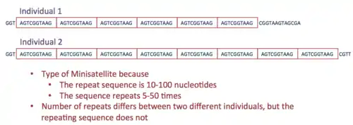 VNTRs are a type of minisatellite in which the size of the repeat sequence is generally ten to one hundred base pairs. Minisatellites are a type of DNA tandem repeat sequence, meaning that the sequences repeat one after another without other sequences or nucleotides in between them. Minisatellites are characterized by a repeat sequence of about ten to one hundred nucleotides, and the number of times the sequence repeats varies from about five to fifty times. The sequences of minisatellites are larger than those of microsatellites, in which the repeat sequence is generally 1 to 6 nucleotides. The two types of repeat sequences are both tandem but are specified by the length of the repeat sequence. VNTRs, therefore, because they have repeat sequences of ten to one hundred nucleotides in which every repeat is exactly the same, are considered minisatellites. However, while all VNTRs are minisatellites, not all minisatellites are VNTRs. VNTRs can vary in number of repeats from individual to individual, as where some non-VNTR minisatellites have repeat sequences that repeat the same number of times in all individuals containing the tandem repeats in their genomes.[1][2]