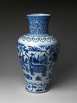 The Vase with the Poet Zhou Dunyi is a traditional Chinese porcelain vase produced in 1587, during the Ming Dynasty.[1] The Vase can be identified by its Wanli Mark and period qualities, constituting its cobalt blue paintings decorating the transparent glazed porcelain.[1] The Vase is now in the Metropolitan Museum of Art in New York City, purchased via the credit line of the Rogers Fund within the Museum.[1] The structure and shape of the vase in accompaniment to the complex iconography is notable as it is meant to encouraging the viewer to read and understanding the image presented and their value in Chinese literati culture.[2]