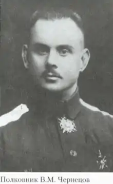 Vasily Mihailovich Tchernetzov (Russian: Васи́лий Миха́йлович Чернецо́в) (March 3, 1890 – January 23, 1918) was a Don Cossack Russian Imperial Army officer who served as a colonel in the Don Army during the Russian Civil War. He led Tchernetzov's Partisans, an independent irregular Don Cossacks military company commissioned after the Act of Ataman by Alexey Kaledin on November 7, 1917.