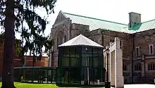 Vassar's campus, also an arboretum,[22] is 1,000 acres (400 ha) and has more than 100 buildings, ranging in style from Collegiate Gothic to International, with several buildings of architectural interest. At the center of campus stands Main Building, one of the best examples of Second Empire architecture in the United States. When it was opened, Main Building was the largest building in the U.S. in terms of floor space. It formerly housed the entire college, including classrooms, dormitories, museum, library, and dining halls.[12][23] The building was designed by Smithsonian architect James Renwick Jr. and was completed in 1865. It was preceded on campus by the original observatory. Both buildings are National Historic Landmarks. Rombout House was purchased by the college in 1915 and added to the National Register of Historic Places in 1982.[24][25]