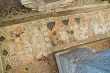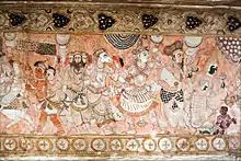 The paintings in each bay on the ceiling of the main mandapa, the antarala and other shrines, depict the grandeur of Vijayanagara pictorial art. They are painted over an initial plaster layer of lime mortar. The colour scheme consists of vegetable and mineral colours of yellow, ochre, black, blue and green blended with lime water; the background is generally painted in red colour. Apart from figures of gods and goddesses, in the presence of the devotees arranged in rows, the frescoes also depict the incarnations of Vishnu.[8] The paintings are in striking compositions where the particular emphasis is on the period costumes and facial expressions.[3]