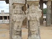 It is at the entrance to the sanctum sanctorum and has a profusion of sculptures and paintings over every inch of space on the columns and ceiling.[4] The images on the pillars and walls are of divine beings, saints, guardians, musicians, dancers and 14 avatars of Shiva. Figurines of the goddesses Ganga and Yamuna flank the entrance to the sanctum.[6] The exterior columns of this hall are built over a decorated plinth; the decorations are in the form of blocks of carved images of horses and soldiers. The columns are slim and have features of colonnettes carved with eaves, overhanging in a curved shape. The open space in the middle part of the hall is defined by large columns or piers which have carvings of triple figures.[3]