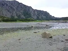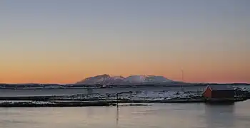 The southwestern part of the island is mountainous, with the highest point being the 803-metre (2,635 ft) tall Trollvasstinden. The rest of the island rather flat and marshy.[1]