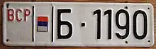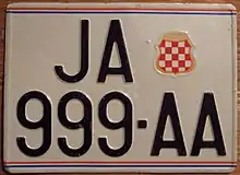 On the territory of the Croatian Republic of Herzeg-Bosnia, license plates were used similar to those of Croatia, with difference in the shape of shield in Croat coat of arms ("checkerboard"-"šahovnica").