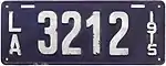1917 | Embossed dark blue serial on white plate; stylized "LA" and "17" at left | none | 12345 | 1 to approximately 27000 | |