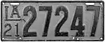 1921 | Embossed black serial on gray plate with border line; stylized "LA" and "21" at left | none | 12345 | 1 to approximately 79000 | |