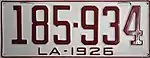 1925 | Embossed red serial on gray plate with border line; "LA 25" at right | none | 123456 | 1 to 40000 | |