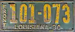 1930 | Embossed yellow serial on green plate with border line; "LOUISIANA-30" centered at bottom; vertical "FRONT" or "REAR" at left | none | 123-456 | 1 to approximately 254-000 | |