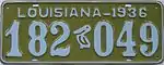 1936 | Embossed light blue serial with pelican separator on olive green plate with border line; "LOUISIANA–1936" centered at top | none | 123-456 | Issued in blocks by horsepower class and branch office | |
