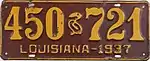 1937 | Embossed golden yellow serial with pelican separator on maroon plate with border line; "LOUISIANA–1937" centered at bottom | none | 123-456 | Issued in blocks by horsepower class and branch office | |