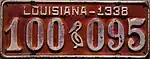 1938 | Embossed white serial with pelican separator on red plate with border line; "LOUISIANA–1938" centered at top | none | 123-456 | Issued in blocks by horsepower class and branch office | |