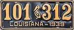1939 | Embossed orange serial with pelican separator on black plate with border line; "LOUISIANA–1939" centered at bottom | none | 123-456 | Issued in blocks by horsepower class and branch office | |