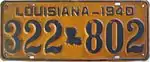 1940 | Embossed dark blue serial with state-shaped separator on orange plate with border line; "LOUISIANA–1940" centered at top | none | 123-456 | Issued in blocks by horsepower class and branch office | |
