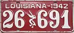 1942–43 | Embossed white serial with pelican separator on red plate with border line; "LOUISIANA–1942" centered at top | none | 123-456 | 1-001 to approximately 384-000 | Revalidated for 1943 with windshield stickers, due to metal conservation for World War II. |