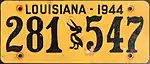 1944 | Black serial with pelican separator on yellow fiberboard plate; "LOUISIANA - 1944" centered at top | none | 123-456 | 1-001 to approximately 380-000 | Manufactured on soybean-based fiberboard due to ongoing metal conservation. |