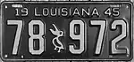 1945 | Embossed white serial with pelican separator on black plate with border line; "19 LOUISIANA 45" at top | none | 123-456 | 1-001 to approximately 341-000 | |