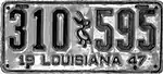 1947 | Embossed black serial with pelican separator on unpainted aluminum plate with border line; "19 LOUISIANA 47" at bottom | none | 123-456 | 1-001 to approximately 356-000 | |