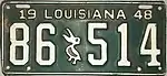 1946 | Embossed black serial with pelican separator on white plate with border line; "19 LOUISIANA 46" at top | none | 123-456 | 1-001 to approximately 337-000 | |