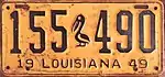 1949 | Embossed black serial with pelican separator on yellow plate with border line; "19 LOUISIANA 49" at bottom | none | 123-456 | 1-001 to 380-000; 435-001 to approximately 485-000 |
