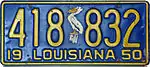 1950 | Embossed yellow serial on royal blue plate with border line; pelican decal used as separator; "19 LOUISIANA 50" at bottom | none | 123-456 | 1-001 to 490-000; 550-001 to approximately 615-000 |