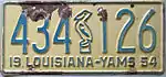 1954 | Embossed blue serial with pelican separator on beige plate with border line; "19" at bottom left and "54" at bottom right | "LOUISIANA-YAMS" centered at bottom | 123-456 | 1-001 to approximately 700-000 | |
