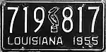 1955 | Embossed white serial with pelican separator on black plate with border line; "LOUISIANA 1955" at bottom | none | 123-456 | 1-001 to approximately 740-000 | First 6" x 12" plate. |