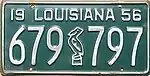 1956 | Embossed white serial with pelican separator on dark green plate with border line; "19 LOUISIANA 56" at top | none | 123-456 | 1-001 to approximately 801-000 | |