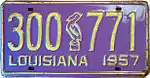 1957 | Embossed golden yellow serial with pelican separator on purple plate with border line; "LOUISIANA 1957" at bottom | none | 123-456 | 1-001 to approximately 865-000 | |