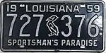 1968–69 | Embossed green serial on reflective white plate with border line; "68 LOUISIANA 69" at bottom | "SPORTSMAN'S PARADISE" at top | 123A456 | Letter corresponds to State Police troop area of issue | |