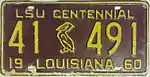 1960 | Embossed golden yellow serial with pelican separator on purple plate with border line; "19 LOUISIANA 60" at bottom | "LSU CENTENNIAL" at top | 123-456 | 1-001 to approximately 934-000 | |