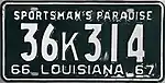 1966–67 | Embossed white serial on dark green plate with border line; "66 LOUISIANA 67" at bottom | "SPORTSMAN'S PARADISE" at top | 123A456 | Letter corresponds to State Police troop area of issue | |