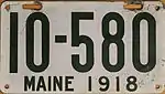1918 | Dark green serial on white flat metal plate; "MAINE 1918" centered at bottom | none | 12-345 | 1 to approximately 42-000 | |||